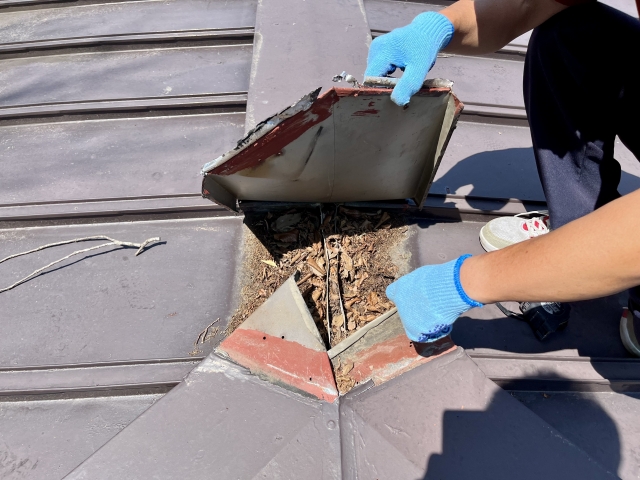 引き起こされる主な劣化症状は、1.貫板の腐食、2.棟板金が浮き飛ばされる、3.雨漏りの3つです。